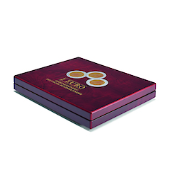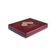 mahagonifarbener Holzmaserung für 16 2-Euro-Gedenkmünzen der 1. oder 2. Serie "Deutsche Bundesländer" in Kapseln. Einlage mit veloursartiger Oberfläche. Die Kassette bietet Platz für ein Motiv je Bundesland und ist für Kapseln bis zu einem Außendurchmesser von 32 mm geeignet (z.B. LEUCHTTURM ULTRA Perfect-Fit 2 €). Edler Deckeldruck, sowie unauffälliger Magnetverschluss. Kapseln nicht im Lieferumfang enthalten. Außenformat: 250 x 30 x 200 mm.
