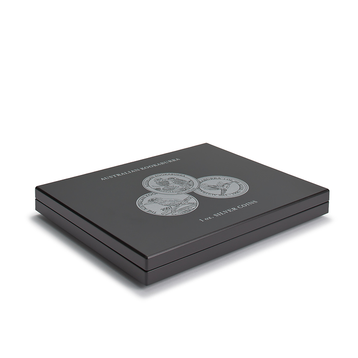 Edle, schwarze Münzkassette zur Unterbringung von 20 Kookaburra-Silbermünzen (Ausführung 1 oz.) in Original-Kapseln. 1 Einlage mit schwarzer, veloursartiger Oberfläche und 20 runden Feldern (Ø 45,4 mm). Silberfarbener Deckel- und Kissendruck mit Kookaburra Münzmotiven. Deckelkissen mit schwarzem Satin gepolstert. Sicherer und unauffälliger Magnetverschluss. Außenformat: 305 x 30 x 245 mm.