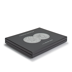 Edle, schwarze Münzkassette zur Unterbringung von 20 Maple Leaf-Silbermünzen (Ausführung: 1 Unze) in Kapseln (InnenØ 38 mm). 1 Einlage mit schwarzer, veloursartiger Oberfläche und 20 runden Feldern (Ø 44,2 mm). Silberfarbener Deckel- und Kissendruck mit Münzmotiv. Deckelkissen mit schwarzem Satin gepolstert. Sicherer und unauffälliger Magnetverschluss.