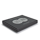 Edle, schwarze Münzkassette zur Unterbringung von 20 Wiener Philharmoniker-Silbermünzen (Ausführung: 1 Unze) in Kapseln (InnenØ 37 mm). 1 Einlage mit schwarzer, veloursartiger Oberfläche und 20 runden Feldern (Ø 42,6 mm). Silberfarbener Deckel- und Kissendruck mit Münzmotiv. Deckelkissen mit schwarzem Satin gepolstert. Sicherer und unauffälliger Magnetverschluss.