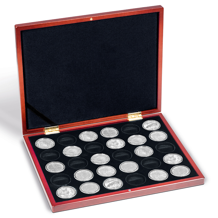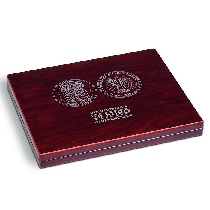 Diese hochwertige Münzkassette in edler, mahagonifarbener Holzmaserung bietet Platz für 30 deutsche 20-Euro-Gedenkmünzen in Kapseln (InnenØ 32,5 mm). Inkl. 1 Einlage mit schwarzer, veloursartiger Oberfläche und 30 runden Feldern (Ø 38 mm). Edler, silberfarbener Deckeldruck mit Münzmotiv der ersten deutschen 20-Euro-Gedenkmünze „Rotkäppchen“. Deckelkissen mit schwarzem Satin gepolstert. Sicherer und unauffälliger Magnetverschluss. Außenformat: 305 x 30 x 245 mm. Kapseln nicht im Lieferumfang enthalten.